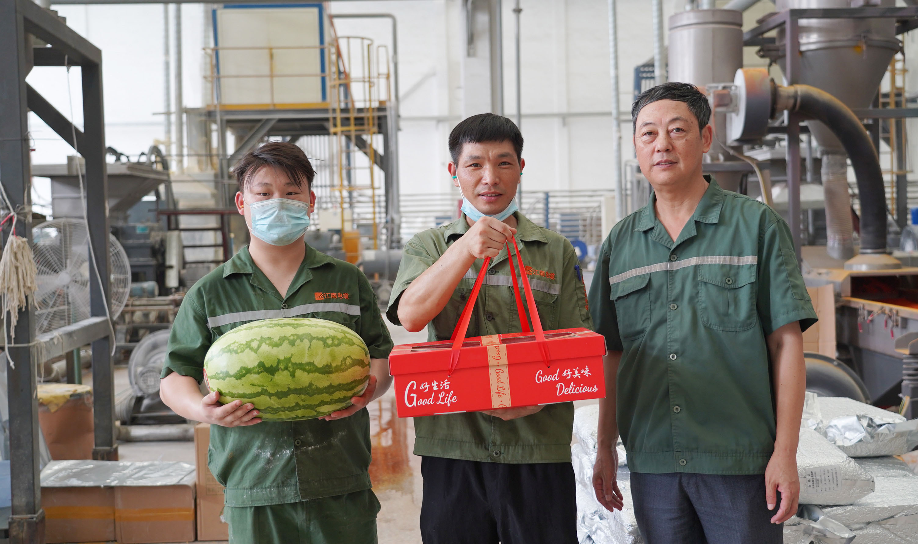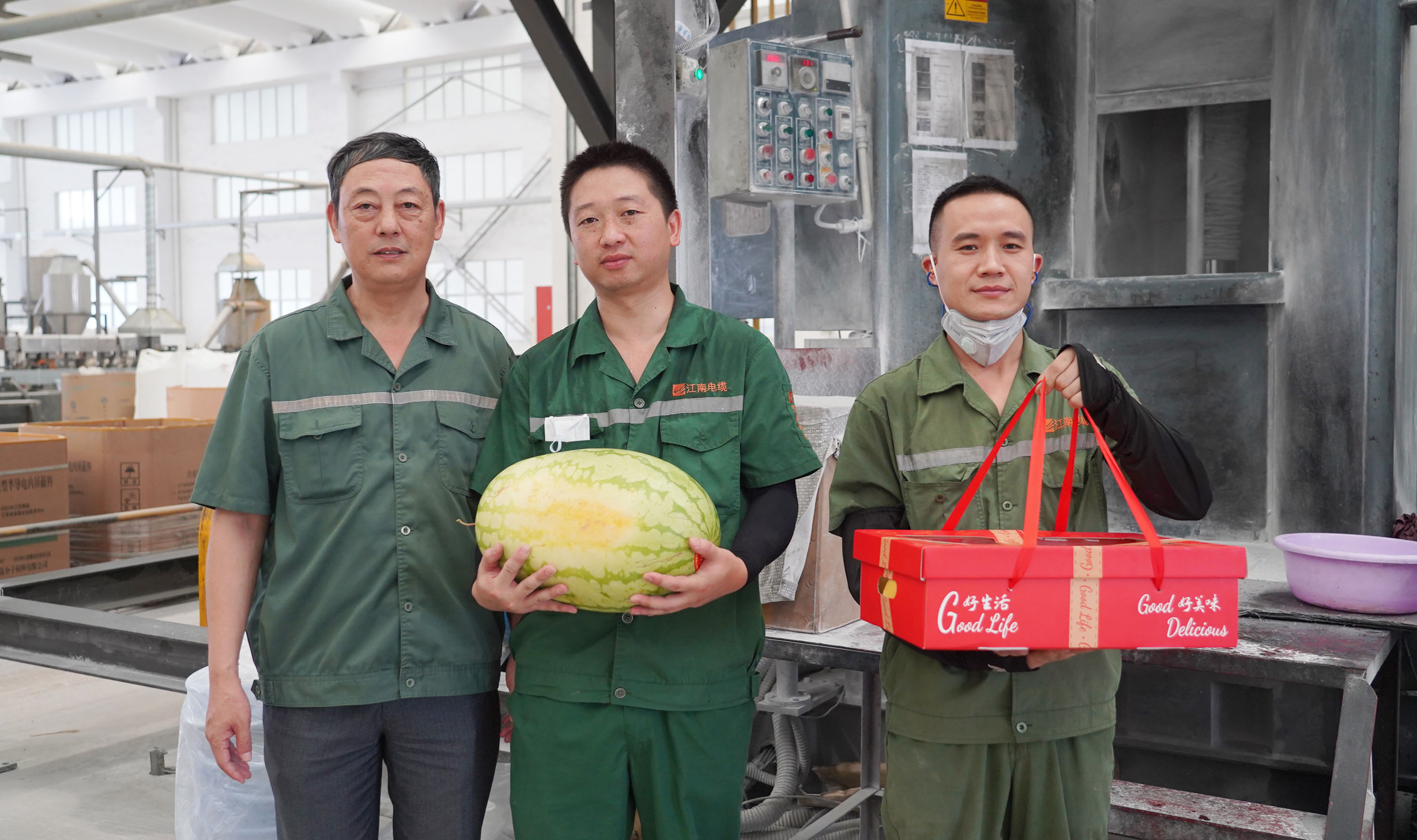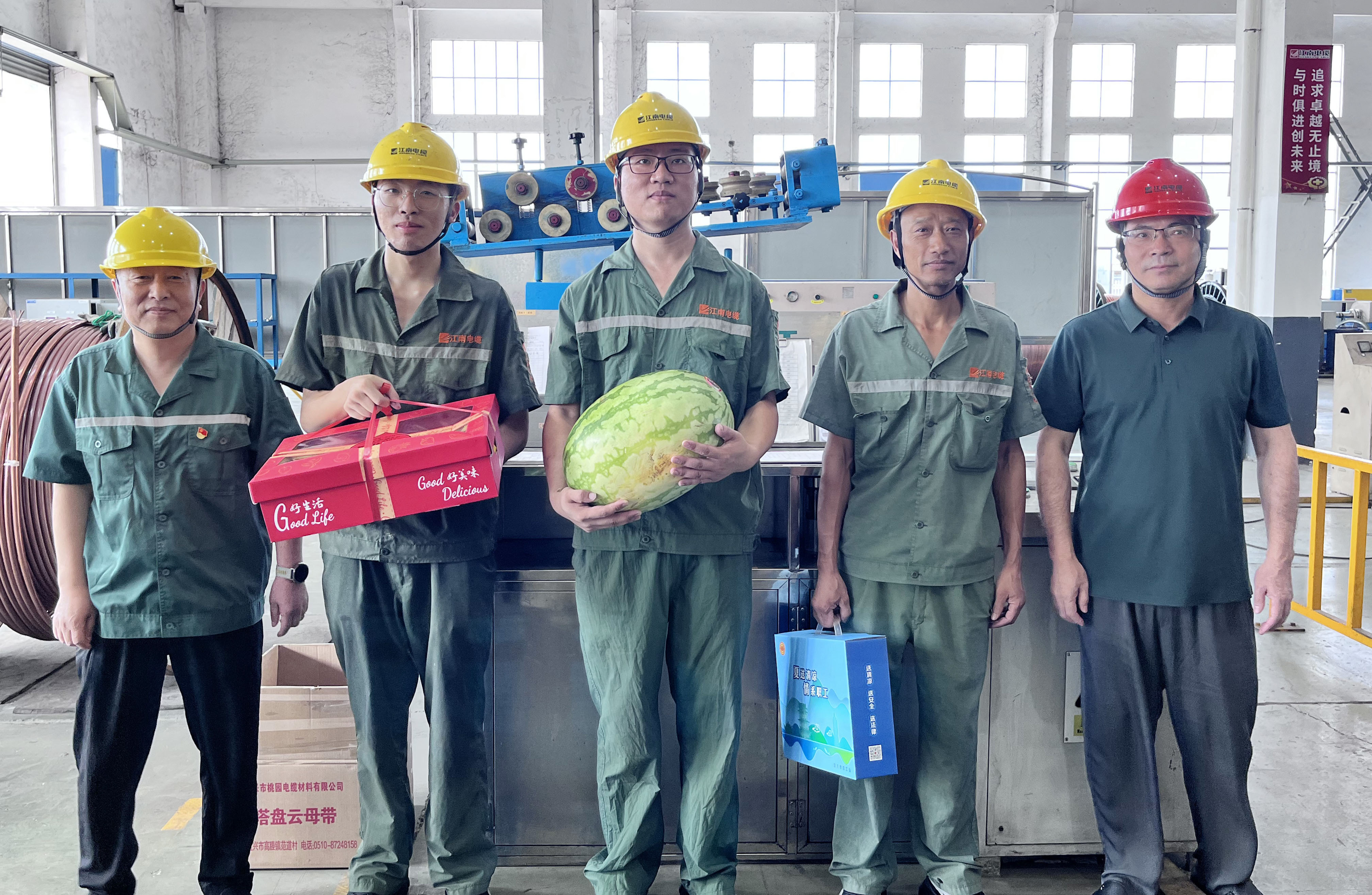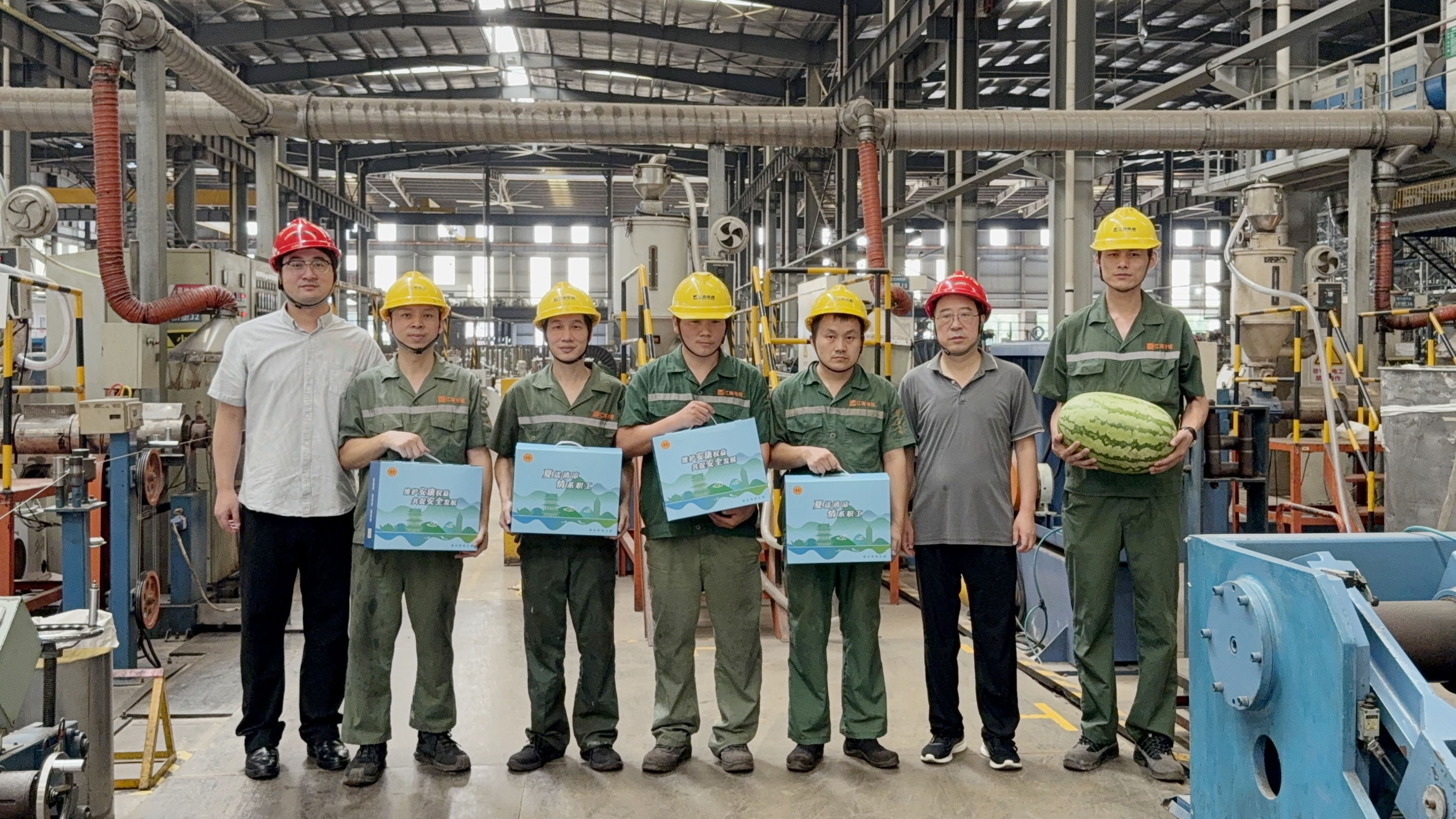 副總經理周駿、總經理助理陸建平赴防火鋁線電纜分廠九車間送清涼